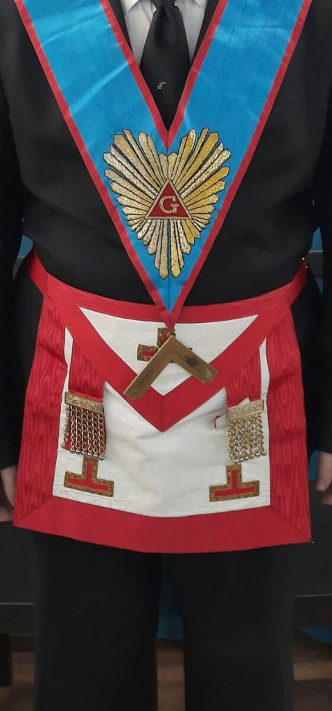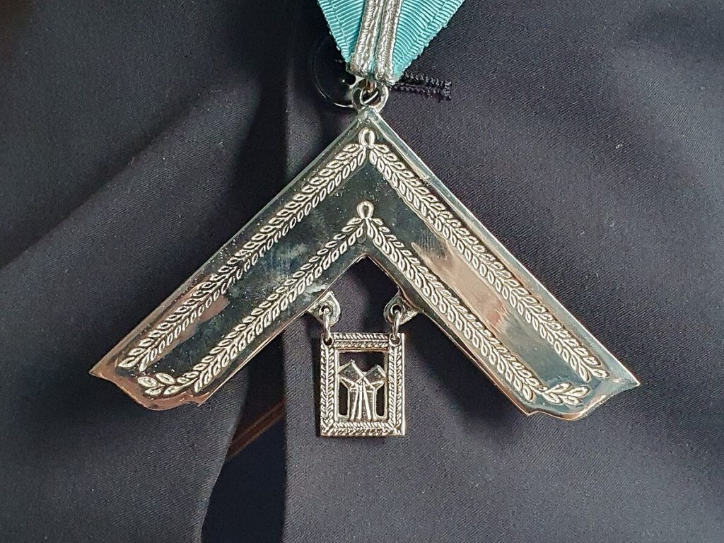 Облачение Досточтимого мастера — нагрудная лента с подвеской в виде наугольника и запон досточтимого мастера с тремя Тау.